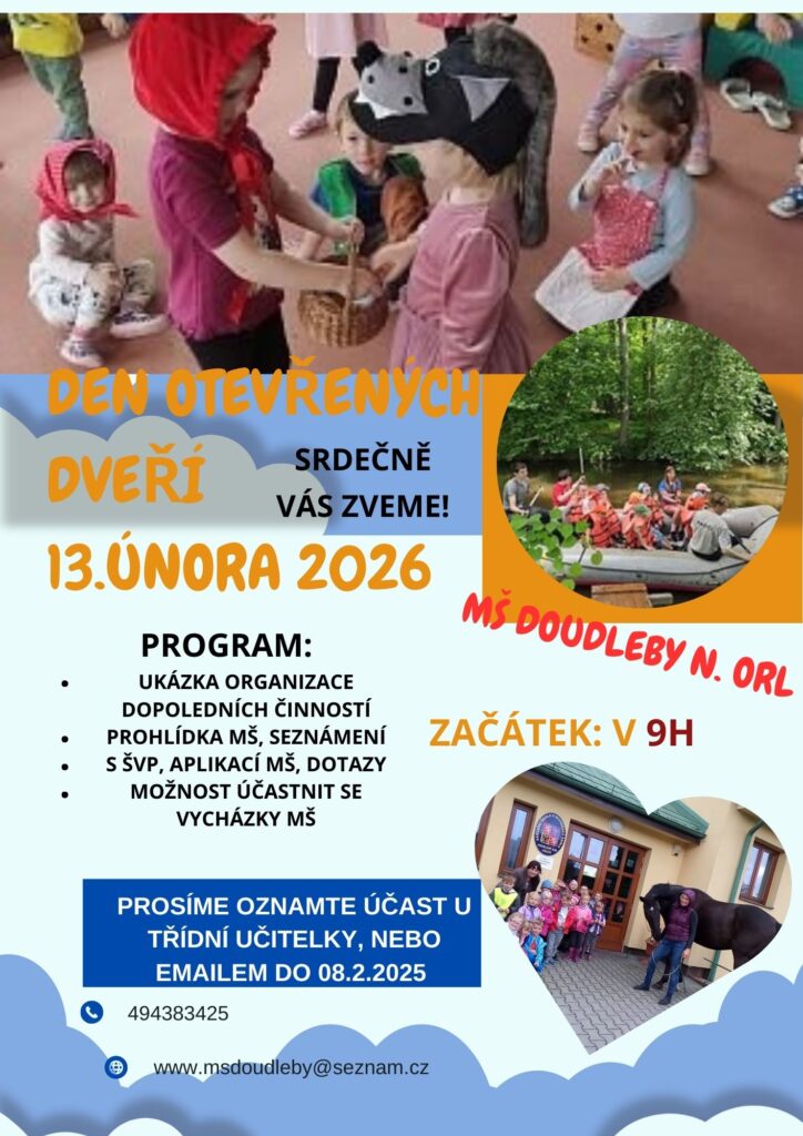 Zveme rodiče s dětmi , kteří mají zájem nastoupit do naší MŠ a rodiče dětí, které již do školky chodí na Den otevřených dveří dne 13.2.2026. Od 9,00 hod se můžete podívat na ukázku činností ve třídách, podívat se po prostorách MŠ… PROSÍME OZNAMTE ÚČAST U UČITELEK, NEBO EMAILEM DO 8.2.2026.
